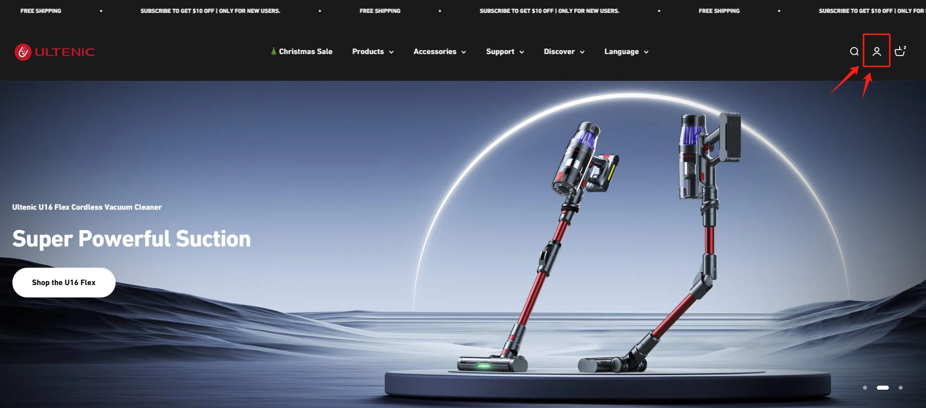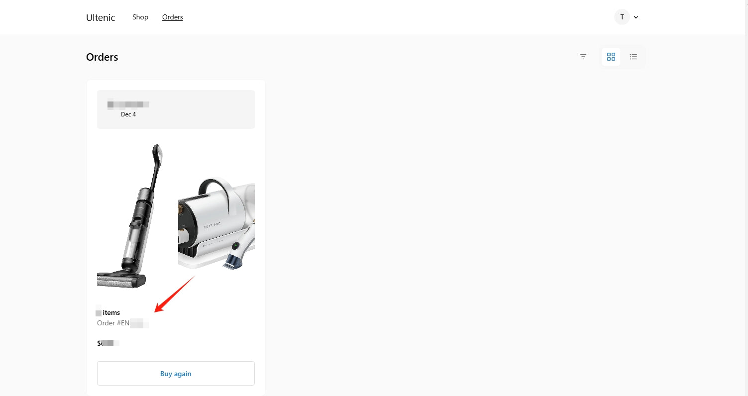 Option 1: Connectez-vous à votre compte sur la page d’accueil et cliquez sur l'icône en haut à droite pour consulter votre historique d'achats et votre numéro de commande.