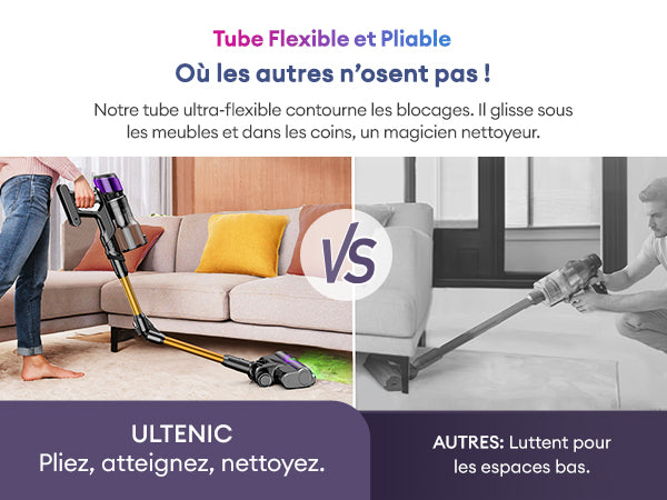 Notre tube ultra-flexible contourne les blocages. Il glisse sous les meubles et dans les coins, un magicien nettoyeur.