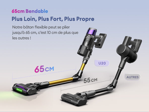 Notre bâton flexible peut se plier jusqu’à 65 cm, c’est 10 cm de plus que les autres ! Grâce à sa conception innovante, il vous permet d’atteindre facilement les endroits difficiles d’accès et de nettoyer sans effort.