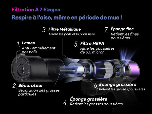 Notre filtre à sept couches assure une respiration optimale. Les lames anti-emmêlement préviennent les enchevêtrements, tandis que le séparateur et le filtre métallique arrêtent les grosses particules. Le cyclone sépare l'air et la poussière. L'éponge grossière retient les grosses poussières, et le filtre HEPA capte les particules jusqu'à 0,3 micron.