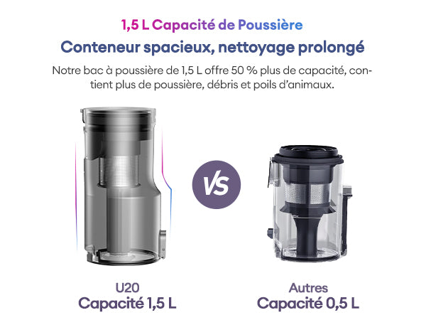 Notre bac à poussière de 1,5 L offre 50 % plus de capacité, contient plus de poussière, débris et poils d’animaux.