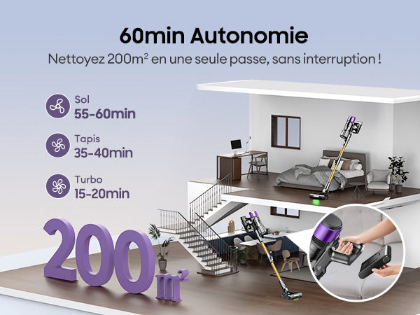 Nettoyez 200 m² en une seule passe, sans interruption ! Grâce à notre technologie avancée, profitez d'une efficacité optimale et d'un gain de temps considérable. Transformez votre routine de nettoyage et obtenez des résultats impeccables chez vous ou au bureau.